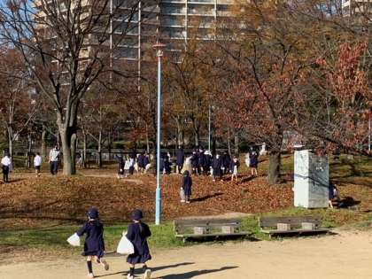 今日は1年生が大川公園に出かけました。生活科の学習でたくさんの落ち葉をひろいました。例年よりも早く落ちてしまっていたようですが、赤や黄色に変化した葉っぱをたくさん採取しました。どんぐりや松ぼっくりも拾いました。学校に持ち返った落ち葉などは画用紙に貼って表現していきます。何ができるか楽しみです。