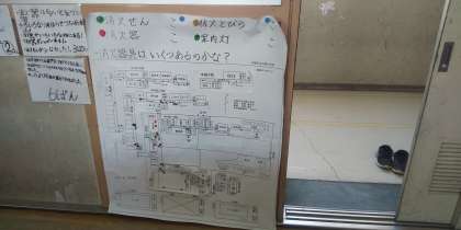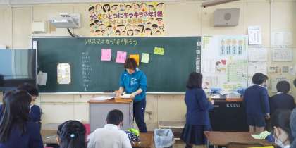 飛び出すクリスマスカードづくりをしています。どの子も思い思いに飾り付けをし、嬉しそうです。壁には、社会で学習した消火器の数調べがありました。