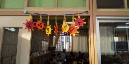 14日から児童会であいさつ運動を始めます。その宣伝に各教室に児童会議のメンバーが回りました。そして、各教室には、太陽の形になったおひさまゲートが飾られました。このゲートをくぐるときは、にこにこ笑顔で「おはようございます!」と元気よく入ってきてくださいね。