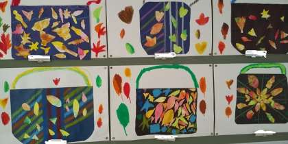 2年生は、秋色のカバンをつくりました。落ち葉がとても上手に表現できていますね。