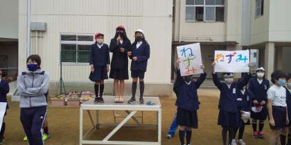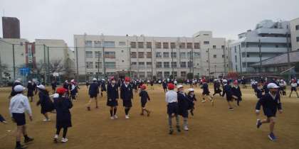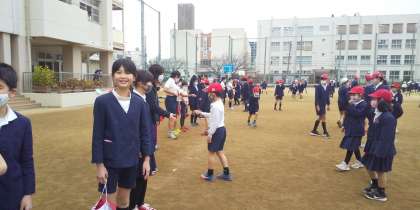 今日、明日とワクワクフェスと称して児童会主催の全校遊びを20分休みに行います。1日目の今日は「ねことねずみ」です。赤組がねこで白組がねずみです。「ねこ」と言われれば「ねこ」が、「ねずみ」と言われれば「ねずみ」がおにになって追いかけます。タッチされた人は、じゃんけん隊の5年生や6年生にじゃんけんで勝てば、また、逃げることができます。広くなった運動場いっぱいに子どもたちが駆け回り、冬空の下、みんなは、ポカポカ暖かくなったことでしょう。明日の「電子レンジおに」もお楽しみに。