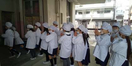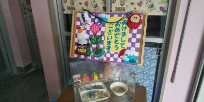 今日の給食は、お正月献立で、れんこんのちらしずし、雑煮、ごまめでした。給食室は、風が吹き抜けて大変寒いのですが、子どもたちの元気な「いただきます」が響いています。