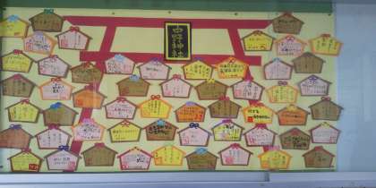 1月の玄関掲示は、5年生が絵馬に今年の目標を思い思いに書きました。