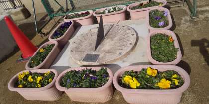 校舎を建て替えて、以前は、花壇の中にあった日時計を国旗掲揚のポールの横に新しく設置しています。周りに花を置いて危なくないようにしました。何時を示しているか分かりますか?
