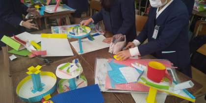 ビー玉が上手く転がるように形や角度長さを調整してコリントゲームを作っています。ちゃんと転がるか試してみて上手く転がらないときは、調整していました。