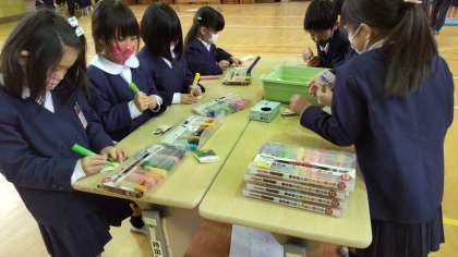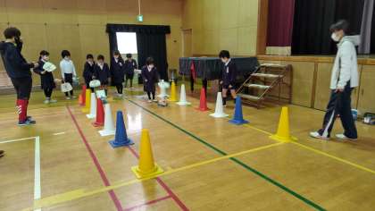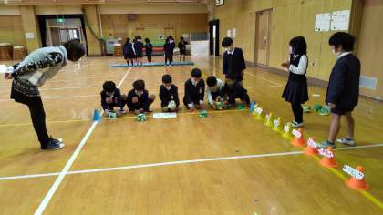 ヨットカー・とことこカメ・パッチンガエルです。1年生に遊び方を説明してやさしく声をかけている2年生です。