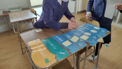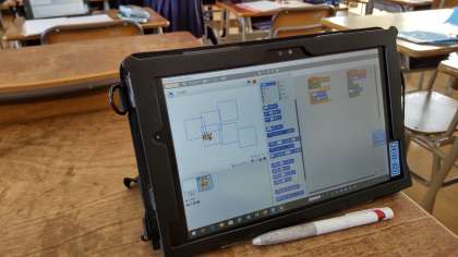 正多角形を定規や分度器・コンパスなどを使って作図をしてきましたが、今日は、スクラッチで正方形をかくことに挑戦しました。はじめにひもで作った正方形の上を実際に歩いてそれからコマンドを考えて考えたプログラムをタブレットで試してみました。スクラッチの中のねこが一瞬で正方形をかくのを見て自分たちが考えたプログラミングが成功して満足そうにしていました。