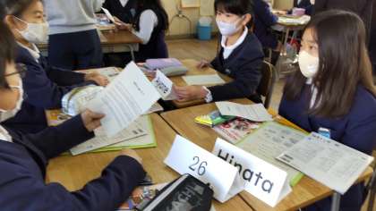 今日は、Who am I?を勉強しました。3つのことを伝えて誰かを当てるゲームです?Are you〜?と答えるとほとんどのチームが正解していたのでYes I am.と返事がかえってきました。その次に、各国との文化の違いを知り、オーストラリアと日本の昼食やテストの採点の仕方の違いに驚いていました。最後にALTのコリーン先生に日本の文化を伝えようとワークツリーを書き出しました。
