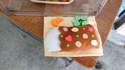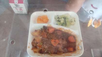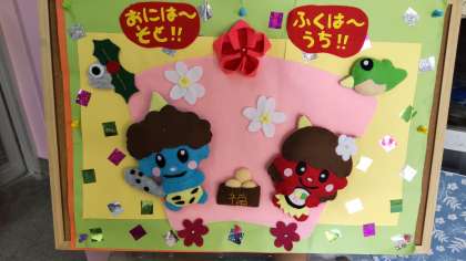 2月になり給食室の掲示が変わりました。今日の給食は、ハヤシライス、キャベツのひじきドレッシング、みかん(かんづめ)でした。メニューに合わせた飾りも給食調理員さんが作られています。今日は、くま・ぞう・ウサギ・ハートなどラッキーにんじんがたくさん入っていました。ちなみに私のには、親ウサギが入っていましたよ。