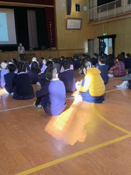 光陽支援学校に通っているお友だちの担任の先生が来校されました。一年の時には一緒には触れ合って学び合うことができましたが、今年度はコロナの影響で本人は来校できませんでした。担任の先生から学校でどんなことを学んでいるか伝えていただきました。