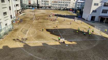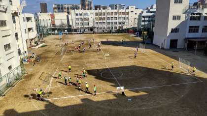 体育でサッカーをしました。パスを上手く送って、シュートしています。