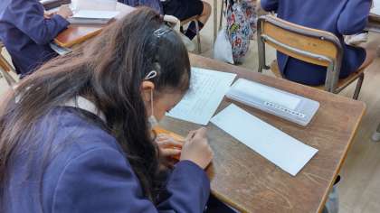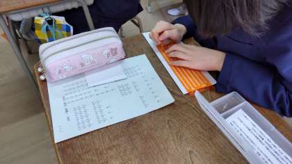 地域の方と社会福祉協議会の方にゲストティチャーできていただいて、点字の成り立ちと点字の打ち方について学習しました。点字には決まりがあってそれが分かると覚えなくてもひらがなが表せることを知りました。六つの点の組み合わせでいろんな文字ができることに驚きました。町の中にもたくさん点字があるので見つけてみてください。