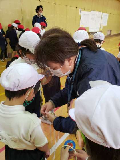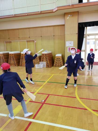 今日は、1年生が昔遊びを講堂でしました。例年なら地域の皆さんに来ていただいて名人から教えていただくのですが、今年はお招きできないので、校内の名人に教えてもらいました。こまは、紐を巻くのが難しく苦戦していましたが、羽つきやだるま落としは回数を重ねると上手にできるようになってきました。今日から休み時間に練習できるように道具を設置します。これからもみんなで昔遊びに楽しんでね。