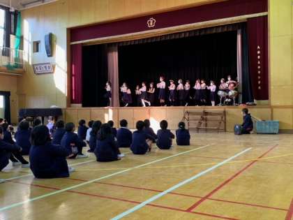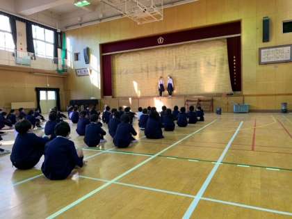 例年であれば講堂の舞台を使い、それぞれのクラブが工夫を凝らした発表を全学年に向けて行うのですがコロナ禍の影響で集まることができません。そこで今年度は全学年に向けては動画を取り、各教室で見ることにしました。3年生は来年度からクラブを選択し、活動することもあり講堂でパフォーマンスクラブの発表だけを見ました。