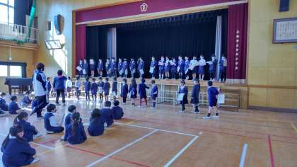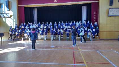 1年生は、入学式に参加できませんが、お祝いのことばを動画にして披露する予定です。今日は、自分の立つ位置を確かめてから練習しました。