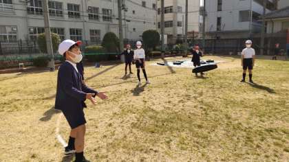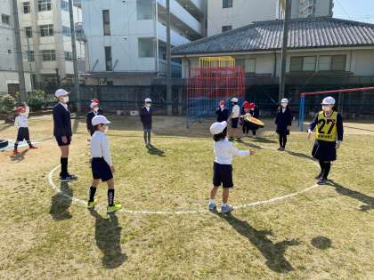 次は、「絆を回せ 中野のフリスビー」です。円の上に班で並んでフリスビーを回します。何秒で回せるかタイムを競いました。相手がとりやすいようにフリスビーは、回せたかな?
