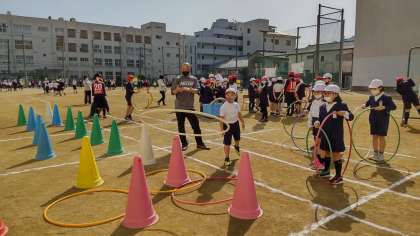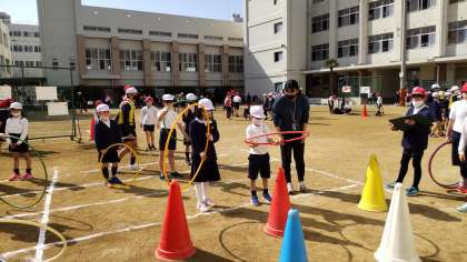 次は、「ヒョイっと ピョンピョン わなげシュート」です。カラーコーンにフラフープの輪を投げます。投げる距離を低・中・高で変えて投げました。近くのコーンをたくさん入れるチームや遠くのコーンに入れるチームもありました。