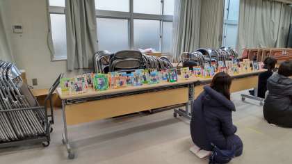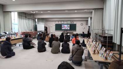 あいにくの雨で本来なら運動場でフラッグの団体演技を見ていただく予定だったのですが、昨日のリハーサルの動画を多目的室で、一クラスずつ見ていただきました。図工で作った写真フレームも飾ってありました。