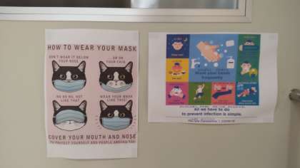 2階にマスクの着用や新しい生活様式について英語で掲示をしています。低学年の子どもたちは、興味をもって見ています。身近なことから英語に触れる機会を増やしています。