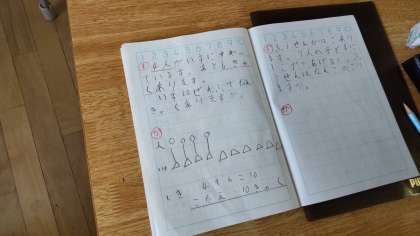 文章題に取り組んでいます。たし算になるか、ひき算になるか図を使って考えました。1年間でノートもしっかり書いて考えられるようになりました。