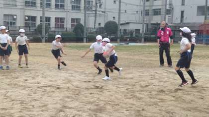3年生は、タグラグビーをしました。2対2でタグを取られないようにパスを回して前が開いたら思い切り駆け抜けてタッチダウンをしていました。3年生も後ろに下がるとペアーの人が前になってしまいパスができないので、前へ攻めるようにアドバイスを受けていました。