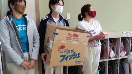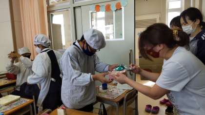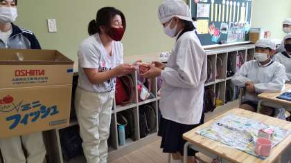 そして、給食調理員さんから6年生に、大人気メニューのレシピや折り紙のランドセルをプレゼントしてもらいました。