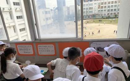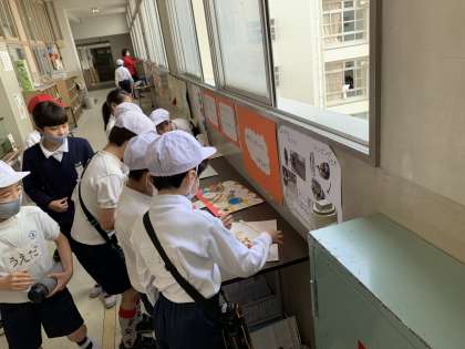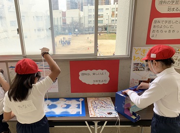 2年生が実際に遊んでいるところです。磁石・音・ゴムなどの性質を使って遊ぶおもちゃがありました。中には、針金に針金で作った輪を通すゲームがありました。針金は、電気を通すという性質を使って、針金通しが触れると豆電球がつくようになっていました。なかなか難しいゲームでした。