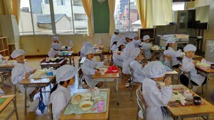 1年生の初めての給食でした。6年生に教室まで運んでもらって着替えることから勉強しました。中には、お代わりしている子もいました。