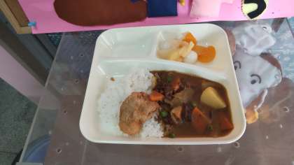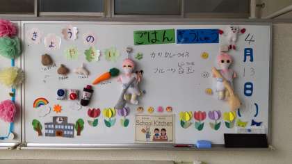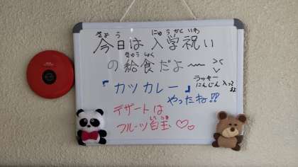 今日の給食は、入学お祝い献立でした。カツカレーライス フルーツ白玉でした。 ウサギやお花などのラッキーにんじんが、あなたのカレーライスには、入っていましたか?給食室の横に給食委員会の人が、毎日献立と入っている食材を掲示しています。