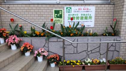 玄関の登り口のチューリップが綺麗に咲いて子どもたちを迎えています。