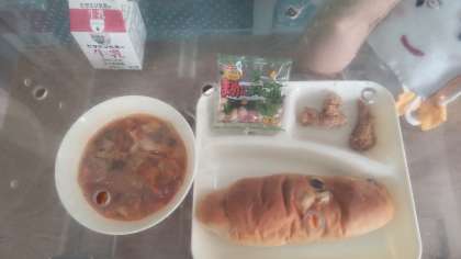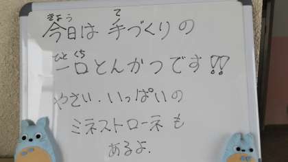 今日の給食は、一口とんかつ、ミネストローネ、豆こんぶでした。一口とんかつは、一つずつ手作りで衣をつけ、揚げています。給食調理員さんは、約1000枚揚げてくれています。おいしかったですね。