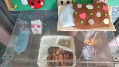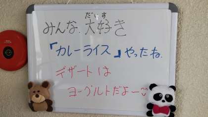 今日の給食は、牛肉と大豆のカレーライス、レタスとコーンのサラダ、ヨーグルトでした。子どもたちの給食人気ナンバーワンのカレーライスです。ウサギ、クマ、ゾウなど動物のラッキーにんじんが入っていました。
