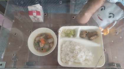 今日の給食は、ちくわの磯辺揚げ、あつあげとさといもの煮物、あっさりキャベツでした。あっさりキャベツは、味付けは塩だけでしたが、キャベツの甘さが出て美味しかったです。ちくわの磯辺揚げも子どもたちの人気メニューです。