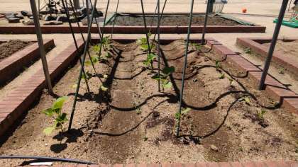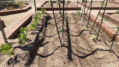 昨年度は、へちまが豊作で、ひょうたんは、連作したせいか大きく育ちませんでした。今年はどちらも豊作になあれ!上の写真の左がインゲン豆、中・右がへちま、下の写真がひょうたんです。
