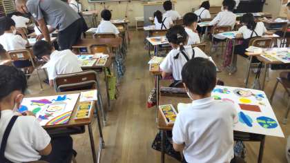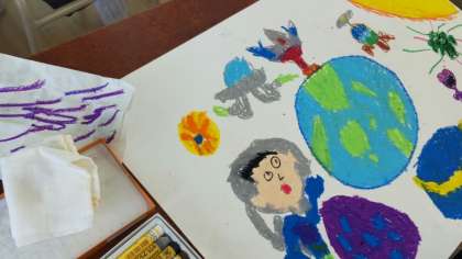 2年生は、「うちゅうりょこう」をテーマに絵を描きました。宇宙空間で横になって浮かんだり、宇宙人に遭遇したり、宇宙服を着たり・・・。パスの塗り込みもしっかりできました。
