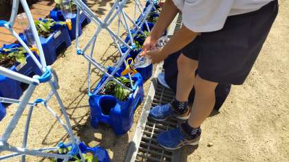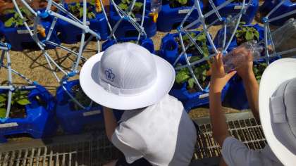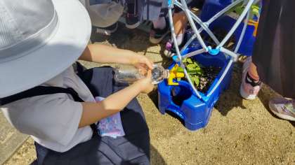 雨が降るたびにあさがおが大きくなっています。本葉も出始めたので、肥料を土の上において、水やりをしました。