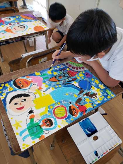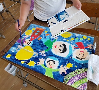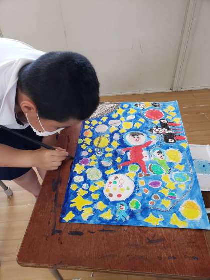 今日は、パスで描いた絵のバックを絵の具で塗って宇宙旅行の完成です。この間Tシャツで練習した絵の具に含ませる量を調整しながら丁寧に塗りました。水彩絵の具をパスがはじくので上手く塗ることができました。