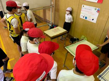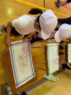 ペア学年で協力して、上に置いてあるペットボトルを落とさないように、布をひきます。