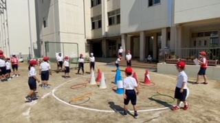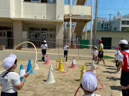 コーンに書いてあるお題をみんなでジェスチャーして、班長さんに当ててもらいます。
