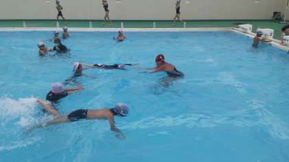 リズムに合わせて泳ぎやすいように区役所で購入していただいた水中スピーカーを使って学習しました。また、先日ご紹介した中野先生は、本校の水泳指導をお手伝いしていただいて16年目になります。苦手な子にスモールステップで進めるよう声かけをしていただいています。