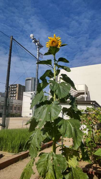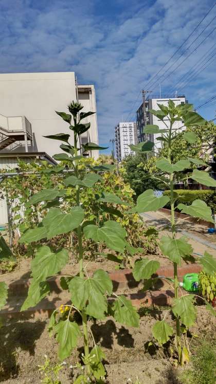 1年生のひまわりが咲きました。背の低いのもつぼみが大きくなっています。