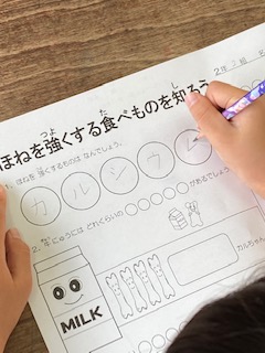 「ほねを強くする食べものを知ろう」がテーマで、カルシウムについて学習しました。牛乳にはカルシウムが227ミリグラム(カルちゃん)あることや、ジュースやお茶にはカルシウムがほとんどふくまれていないことなどを学習しました。