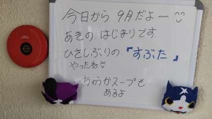 今日から9月です。掲示が変わりました。秋空になってお月様が綺麗に見える日が増えてきました。今日の給食は、酢豚、中華みそスープ、焼きのりです。今日もしっかり食べれたかな?