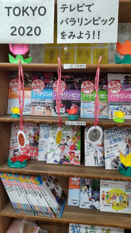 オリンピック・パラリンピックの棚を作ってくださっています。今は、パラリンピックが行われているので、ボッチャ個人で金メダルを取られた杉村さんが本の表紙に載っていたので1年生の児童が「あっ きのう 金メダル取った人や!」とみんなで話していました。