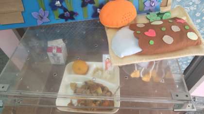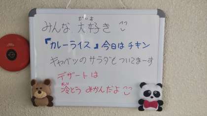今日の給食は」、チキンカレー、キャベツのサラダ、冷凍ミカンでした。今月は、アレルギー対応月間なので、カレールーは、米粉使用で、サラダのマヨネーズは、ノンエッグでした。フェルトで作ったカレーライスも、ミカンも登場です。