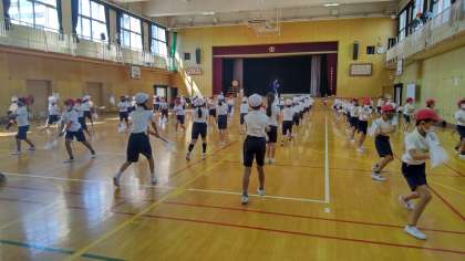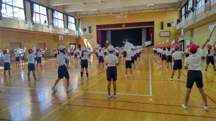 3年生は、今年はフラッグを使って演技をします。練習は、少し小さめのフラッグですが、当日はカラフルな色のフラッグで演技します。