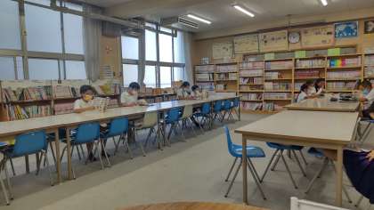 図書室でも静かに読書を進めています。図書室の本で調べ学習をしている子もいました。
