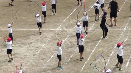 1年生は、ダンスの練習の後にかけっこの練習をしました。直線30メートルを走ります。2年生は、運動場の自分の位置を確かめて輪っかをもって演技をします。、