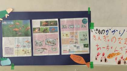 1年生で飼ってる金魚について係の子が調べたことを掲示しています。