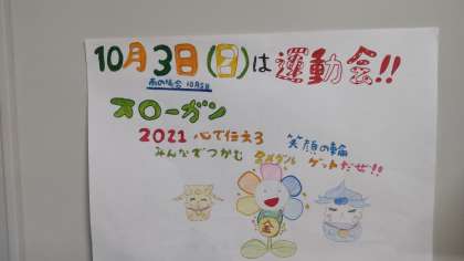 明日は運動会です。子どもたちは、運動会に向けて頑張ってきました。特に高学年は、当日の役割だけでなくそれぞれの委員会で準備をしてきました。このポスターもその一つです。明日は、入校証と検温表を忘れずにお越しください。会場では、他の方と距離を取ってご観覧ください。どうぞよろしくお願いいたします。